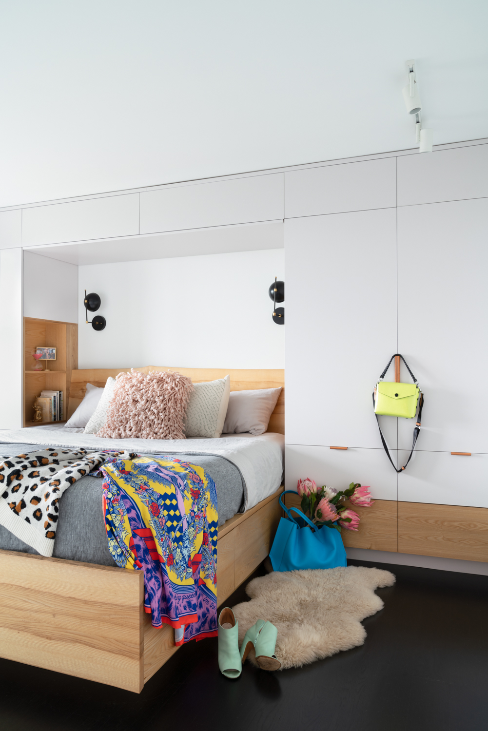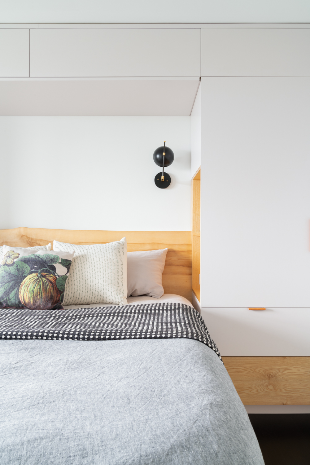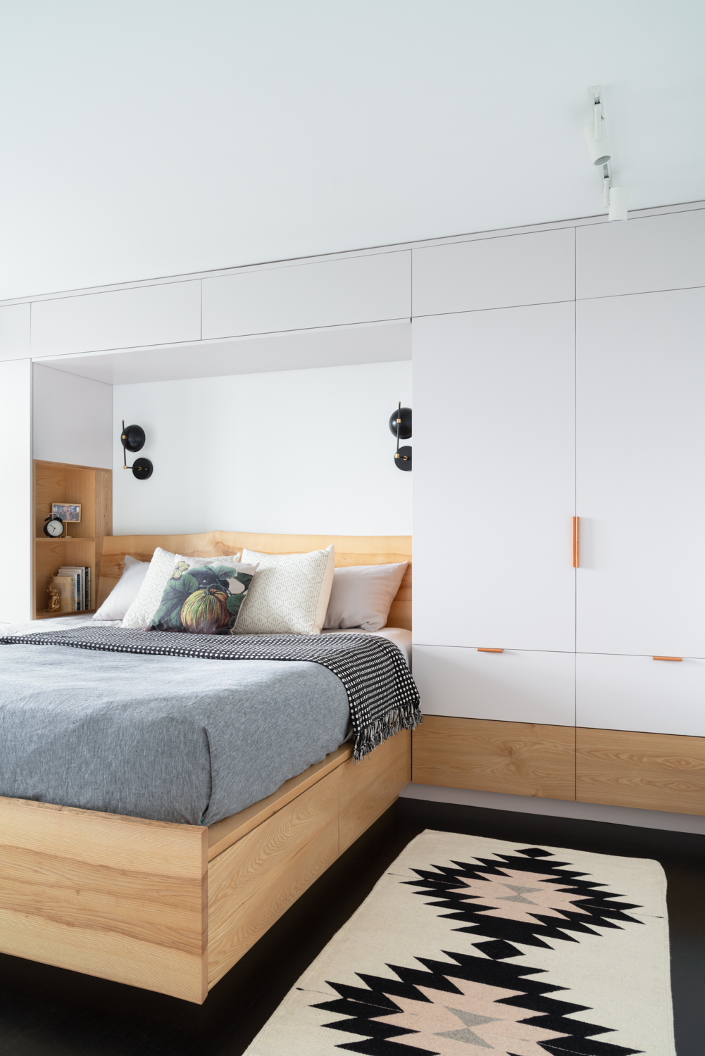 The master suite includes a custom designed and built oak bed, integrated into his-and-hers closets, complete with upper “attic” storage, and drawers under the bed. Next to the bed, built-in nooks provide a spot for a book and to charge devices.