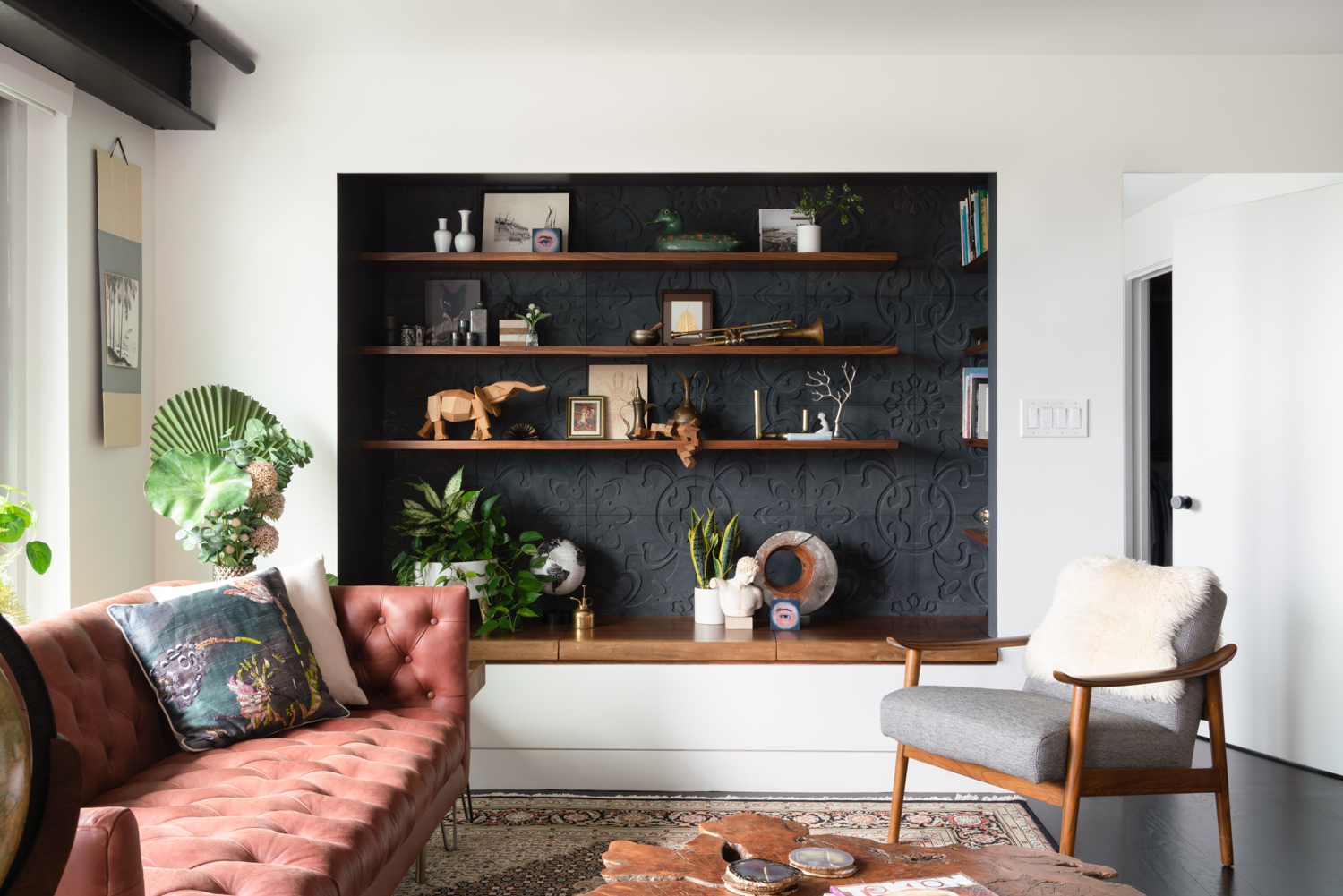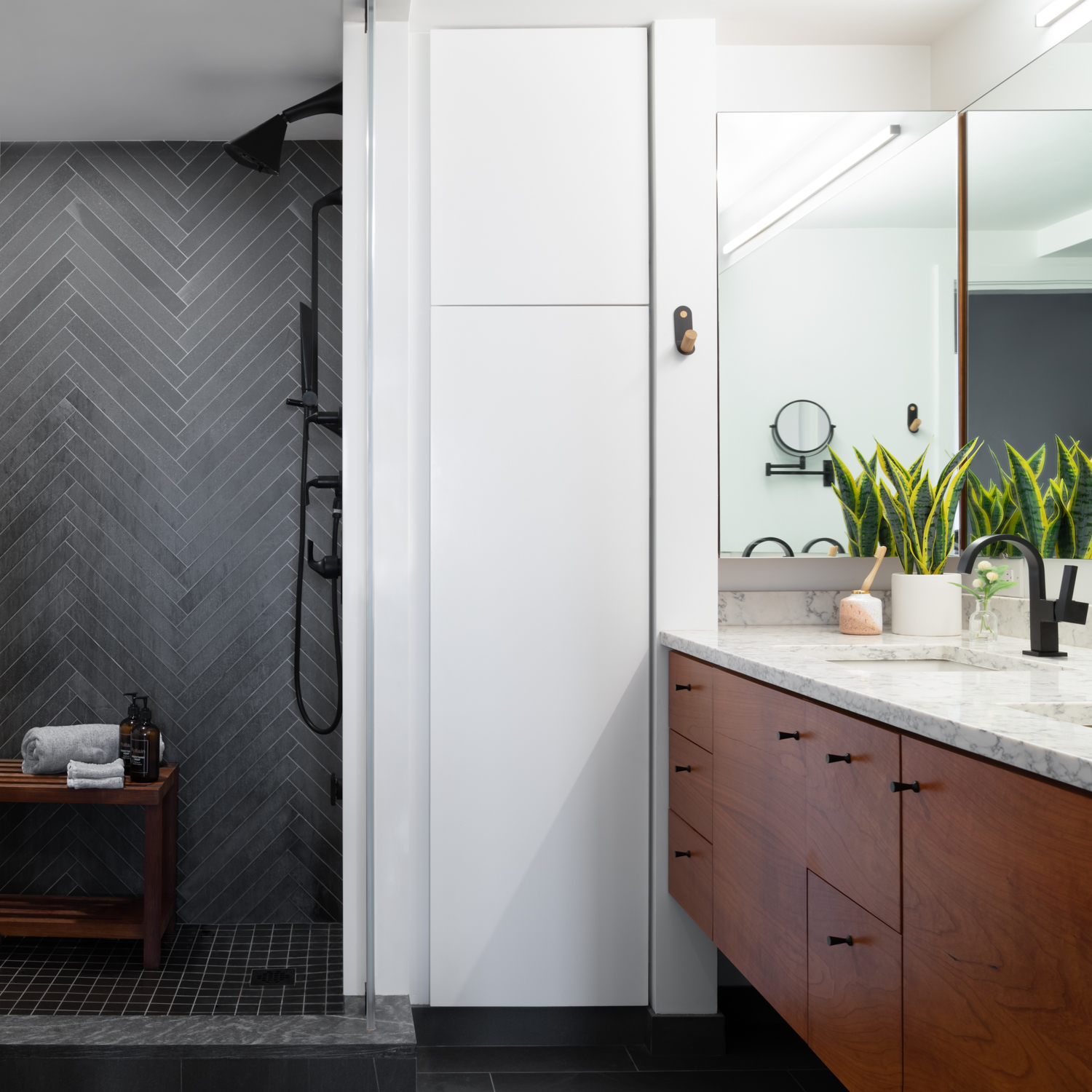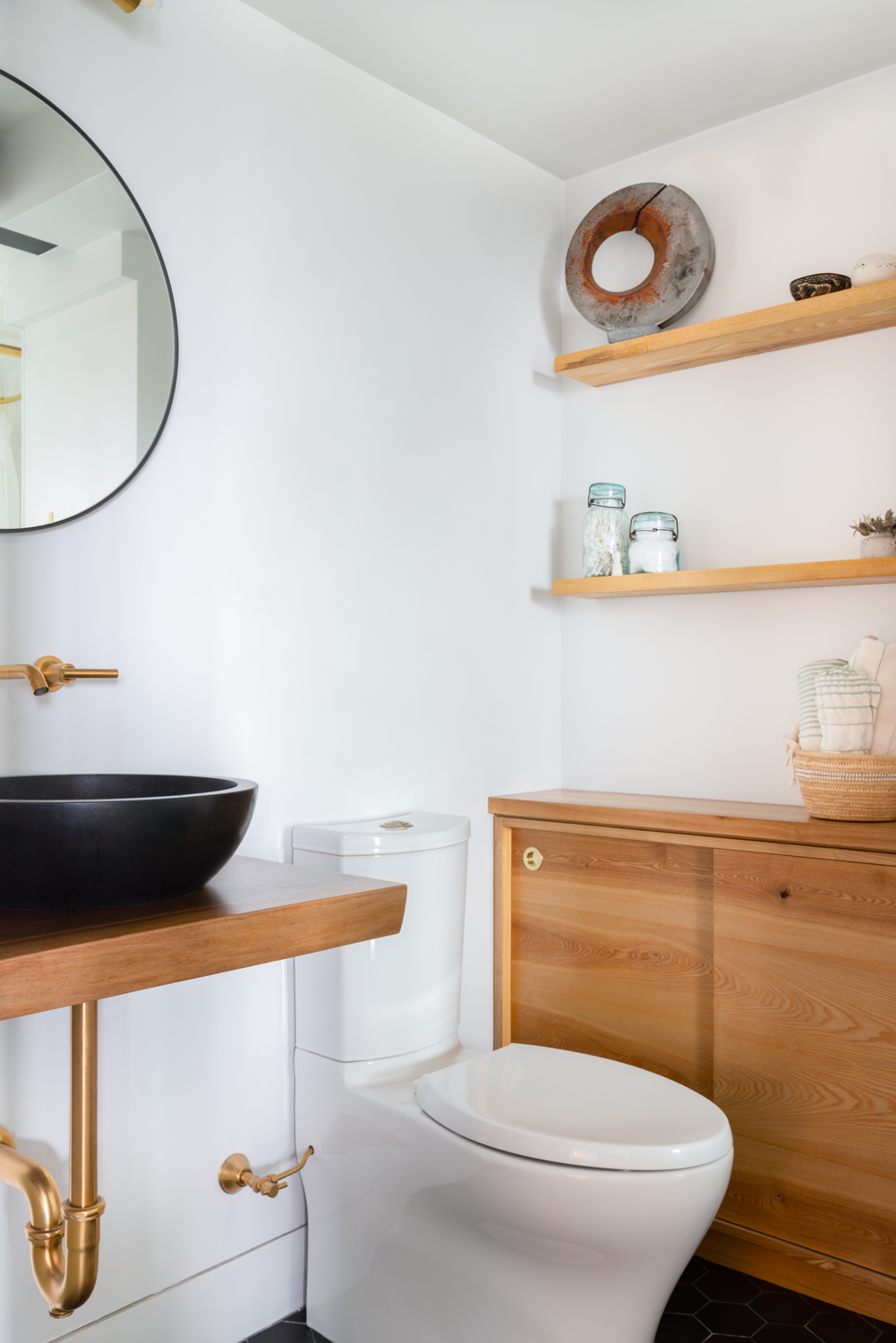 “Everything doesn’t have to be exactly the same in a small space,” Moedinger says in reference to choosing different [materials]. “Contrasts can make a home feel bigger by providing a variety of experiences.”