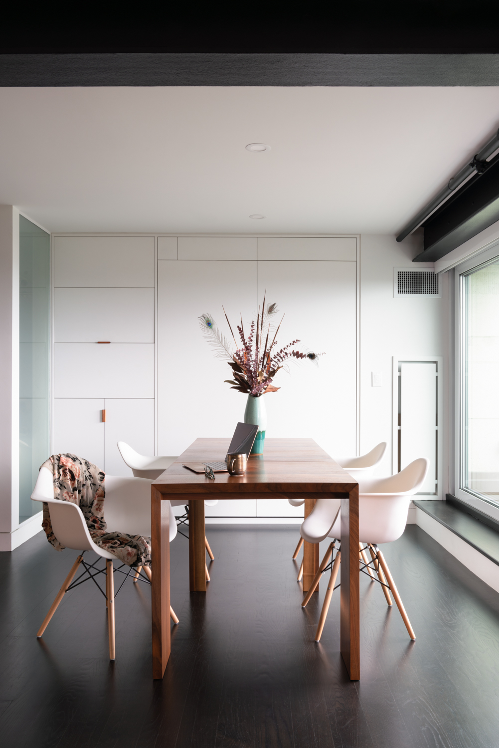 To help create more space in the unit, we removed the drop ceiling and revealed the steel structure of the building, which we used as armature for hidden lighting. We also included a dedicated laundry room, coat closet, and pantry – imperative, especially in small, open spaces, to keep stuff out of sight.