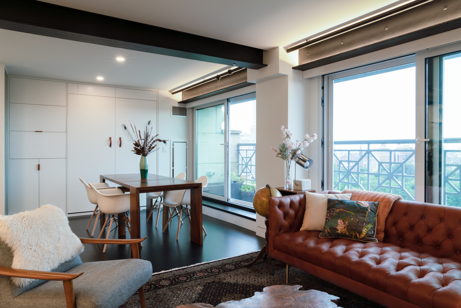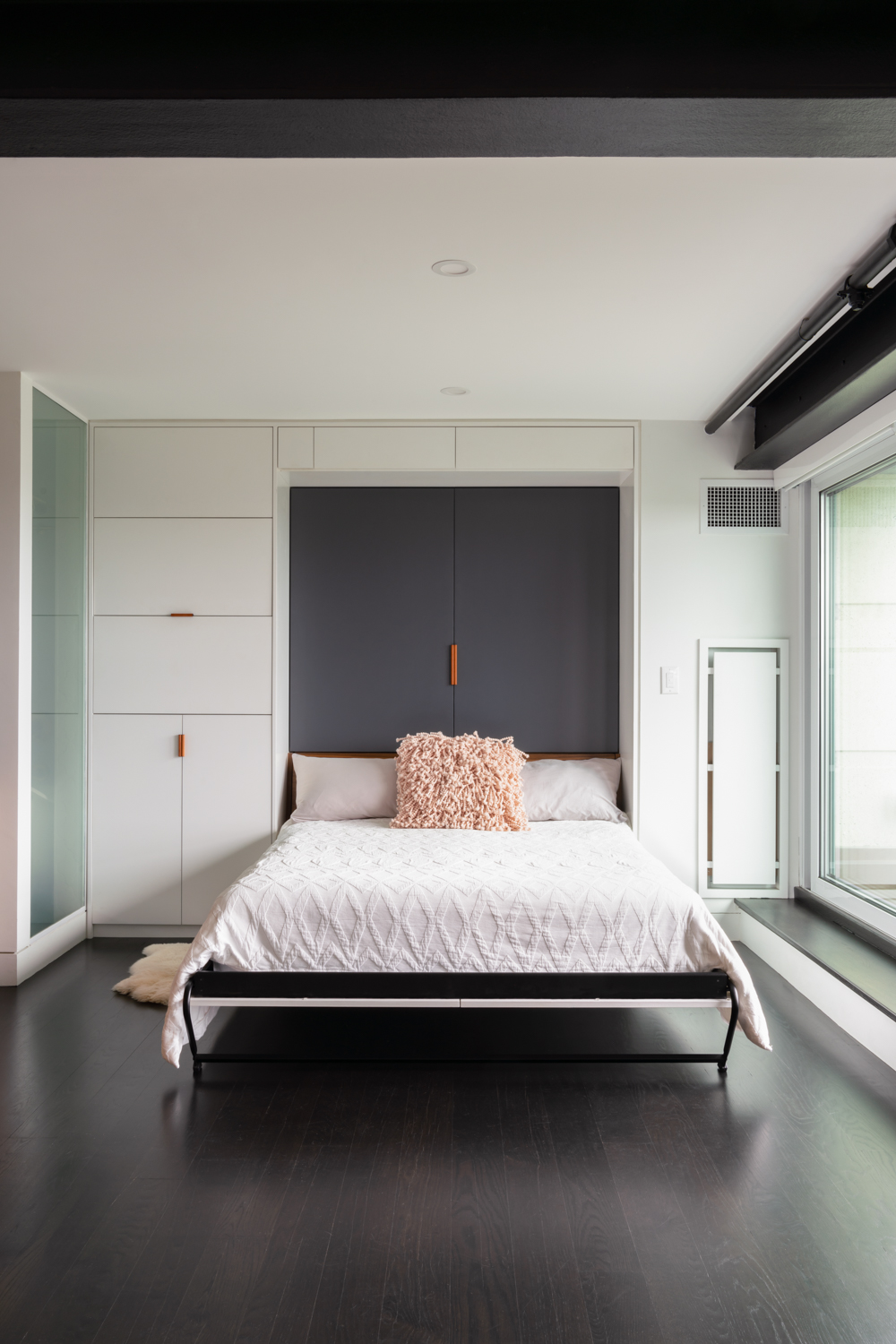 When we first toured this penthouse unit with our clients, the most impressive thing was the view….the interior was dated and dark, and not functional for entertaining and hosting overnight guests. Our challenge was to work with some serious constraints and somehow find extra space in every way we could – to support a fully open space for entertaining, that meant finding dedicated storage for everything from the vacuum cleaner to a bed, from a dining table to some spare walls, and from blankets to clothes. And we did it!