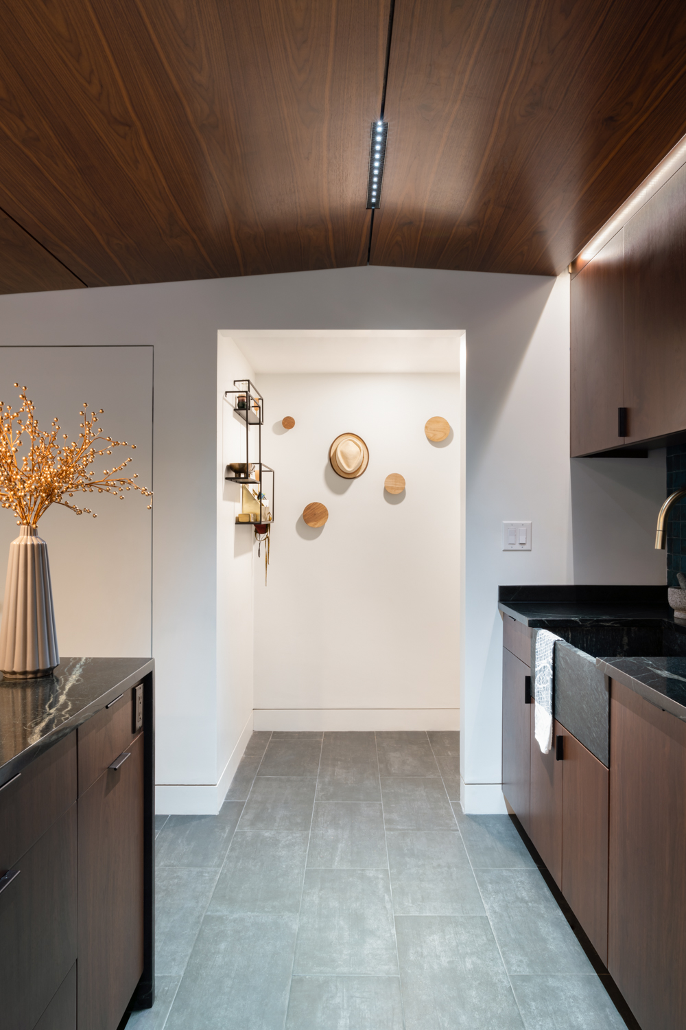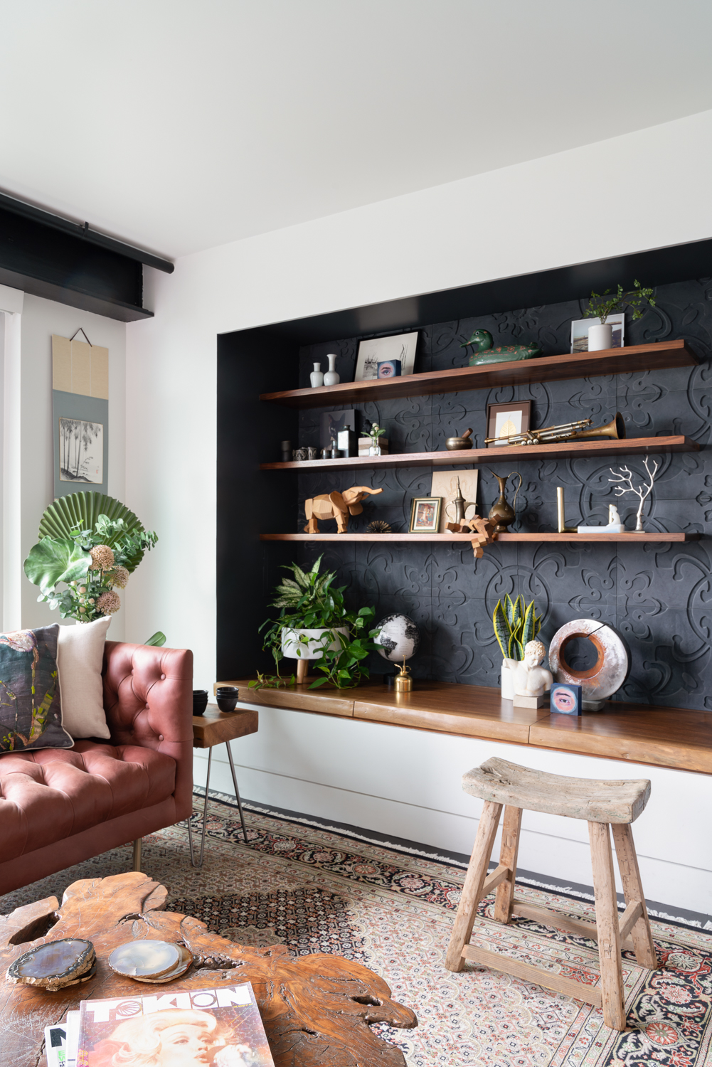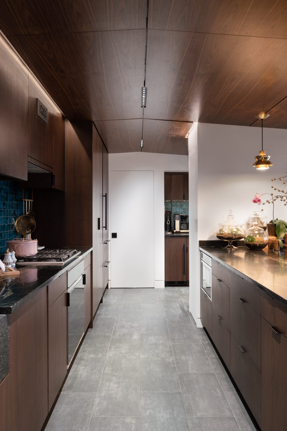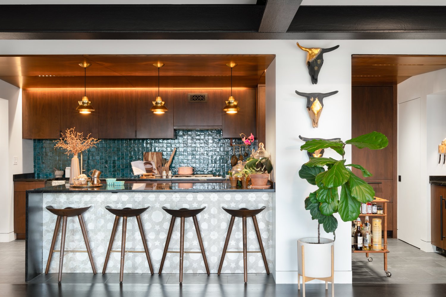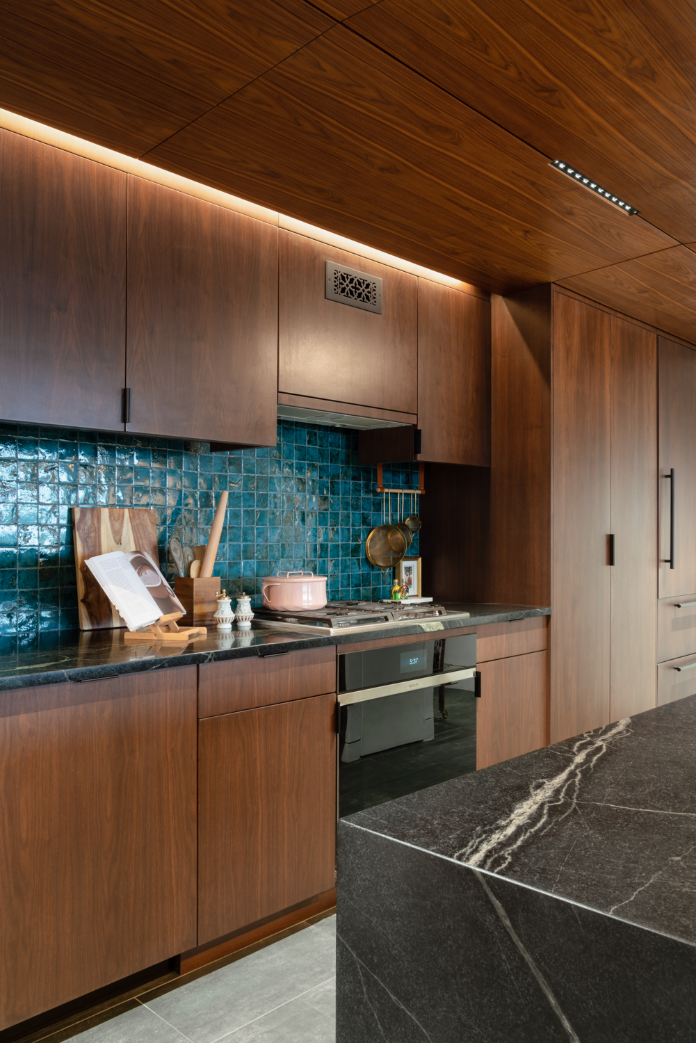 We moved the kitchen from a dark corner out to the main space, and, inspired by our clients’ directive to create a dark, moody, dramatic space, rendered the space in walnut, soapstone, brass, custom tiles, and hidden light fixtures. Perfect for entertaining, the giant island looks into the main space of the home, and the dramatic views of Boston and Cambridge. The living room area has another “dark” space, where concrete tiles, walnut shelves, and hidden storage double as additional seating area.