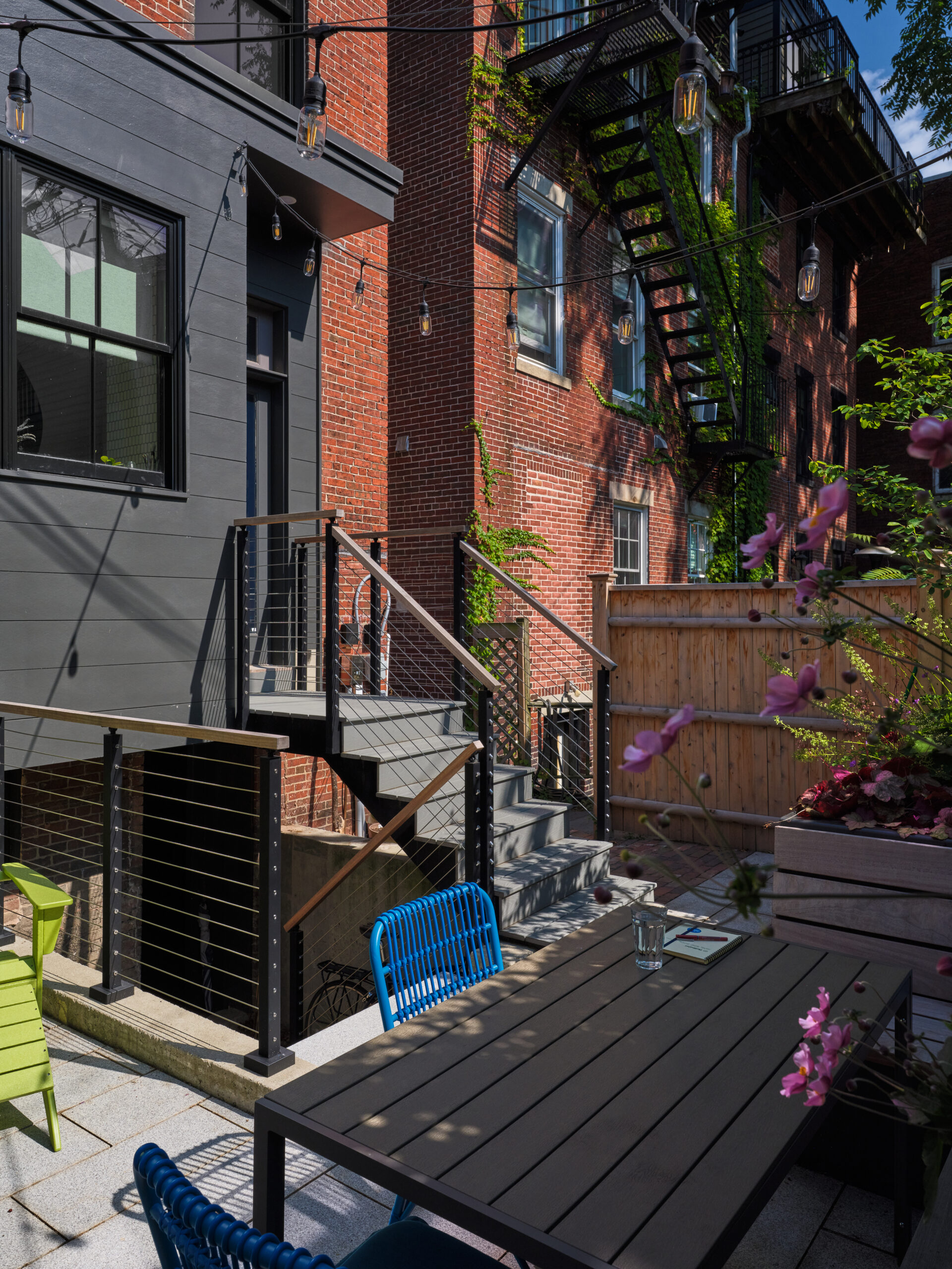 And last but not least, of course, is the backyard - expertly designed by Offshoots, Inc. The same theme held outside as inside - packing as many activities into a tight space, without feeling cramped. A built in planter/bench, a grilling station, pollinator friendly plants, an herb garden, bike storage, a sitting area, trash storage, and access to the basement all manage to fit in this jewel of a backyard!