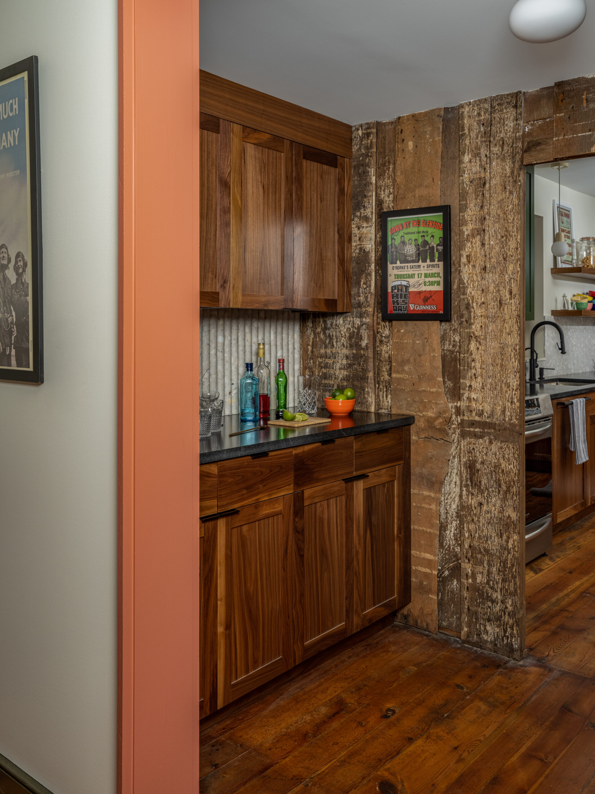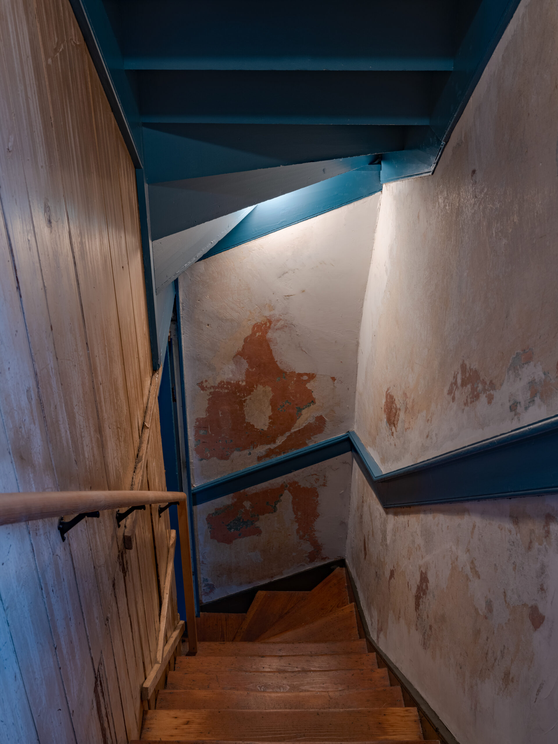 The house retains its shape, all interior walls, all stairs, all window and door locations, and all original trim, flooring, and woodwork; this was a huge design challenge, as many of these attributes conflict with contemporary living patterns of open spaces, numerous bathrooms, and the stuff of life like washer/dryer, closets, and kitchen counter space.