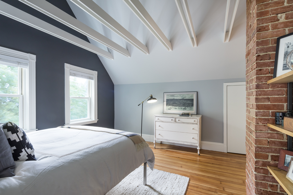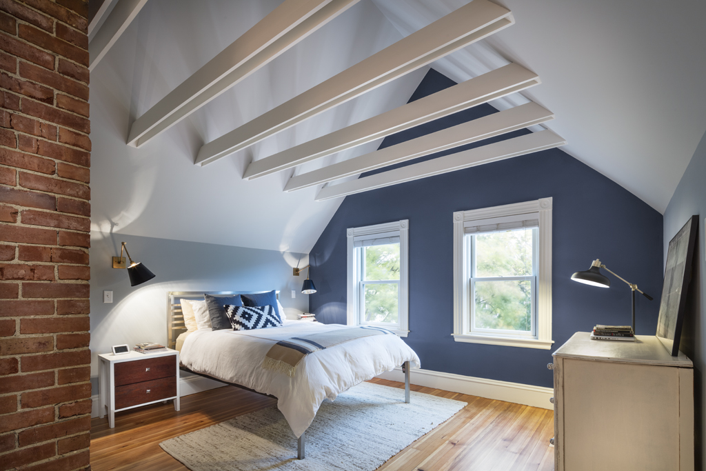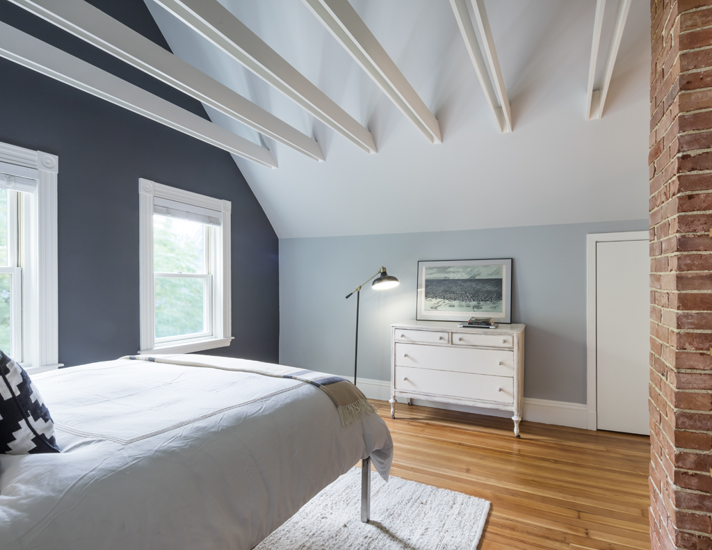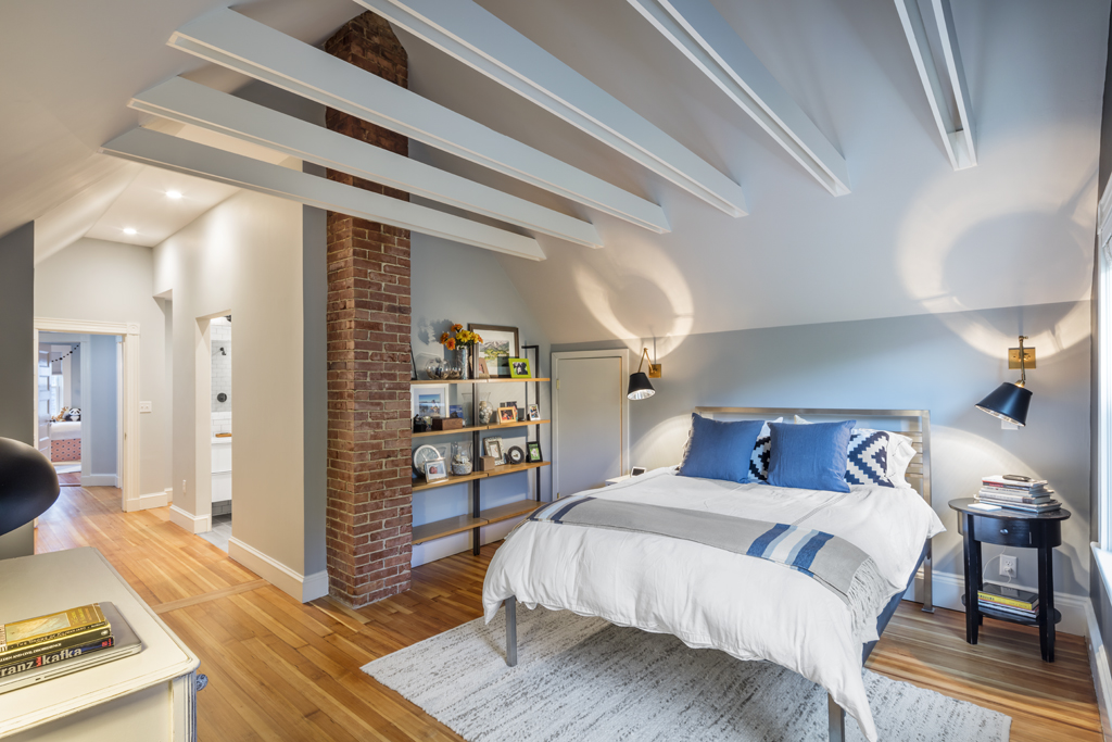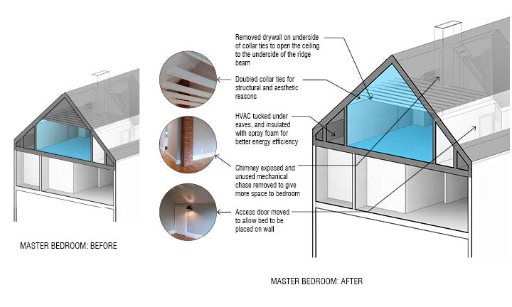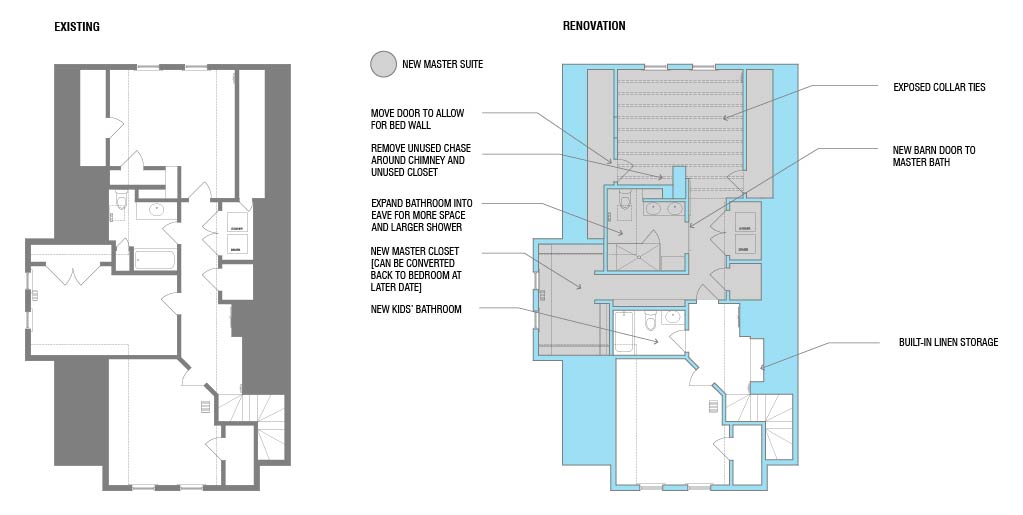 We ended up creating a master suite by taking over a bedroom for a closet, but planning the space such that the closet could be turned back into a bedroom at a future date. We also took advantage of eave space to expand the bathroom, found underutilized space around a disused chimney, and raised the ceiling in the master bedroom – again taking advantage of eave space.
