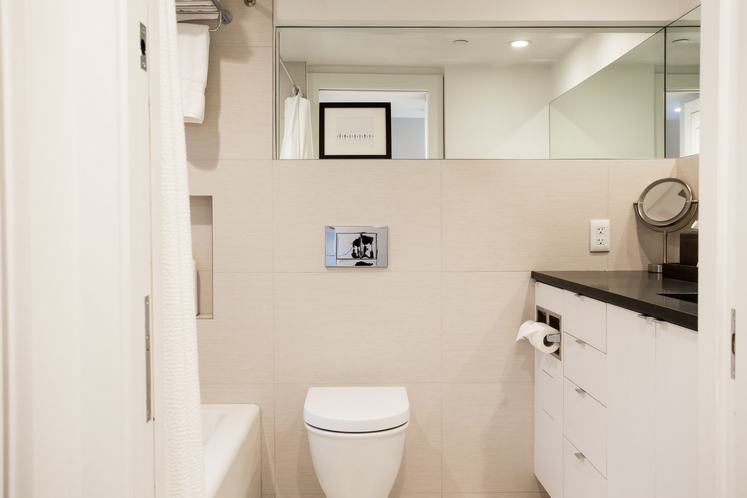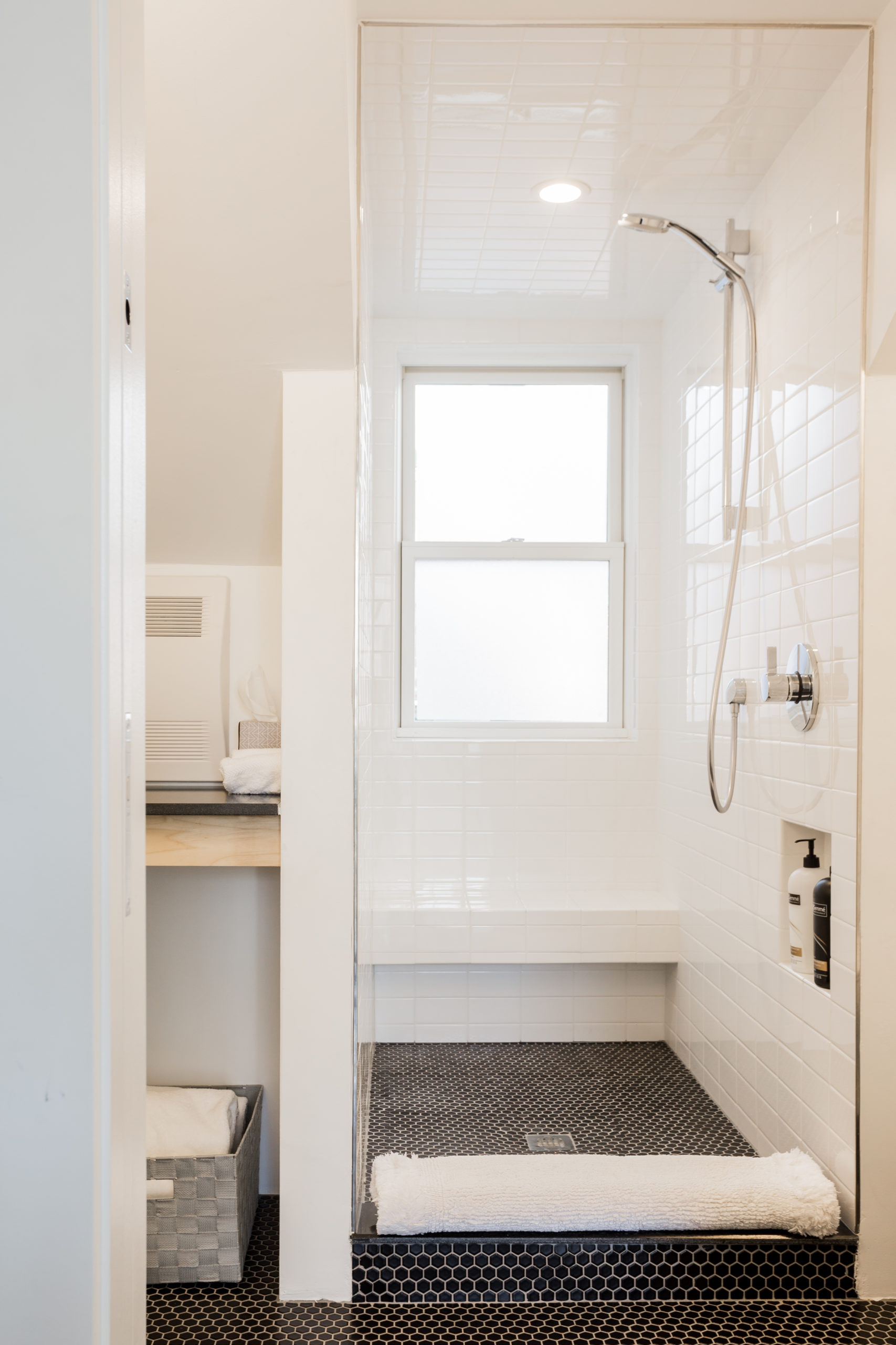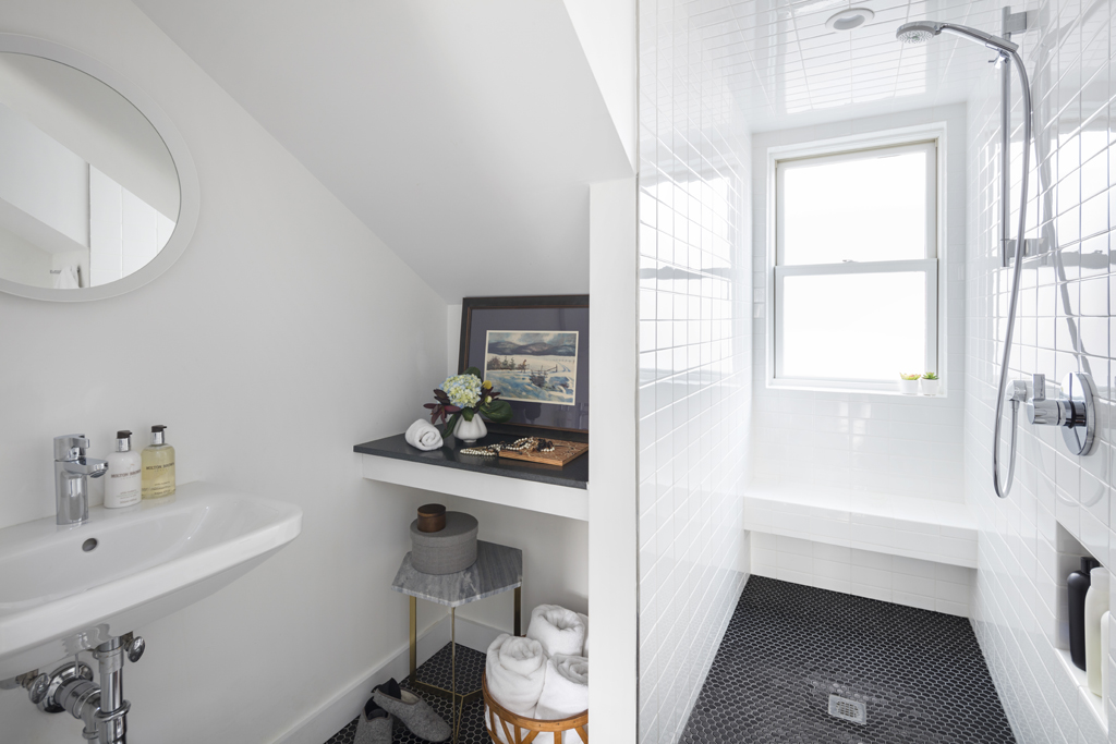 The house features two master suites on the second and third floors, a new roof deck, and creative mechanical and structural solutions. Built-ins, use of knee-space, and clever lighting strategies also help maximize and customize the space for a discerning client.